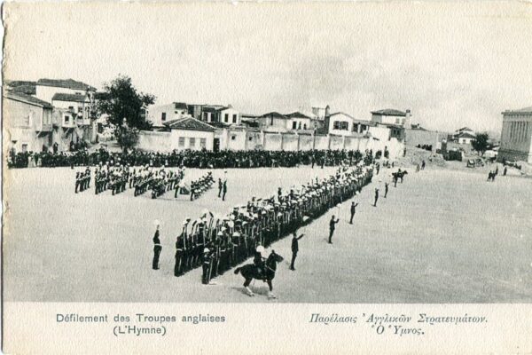 Greece: Unused postcard titled ‘Defilement des Troupes anglaises (L’Hymne)’. ed. Nicolaus Alikiotis #251