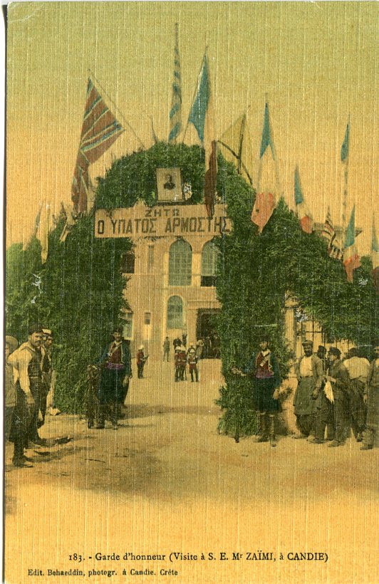 Greece: Unused silk postcard titled ‘Garde d’honneur (Visite a S.E. Mr ZAIMI, a CANDIE)’. ed. Behaeddin #183