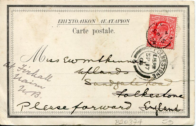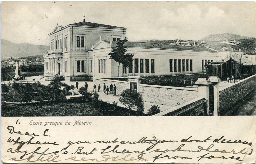 Greece: 1904 postcard titled ‘Ecole grecque de Metelin’ used in England from London to Folkestone