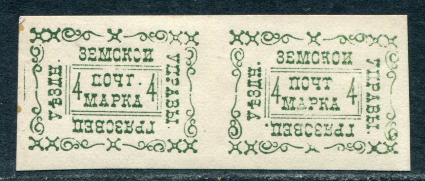 Russia – Zemstvo: 1889 Griazovets 4k mint o.g. horizontal pair one with missing dot after ΠΟЧΤ variety. Schmidt 24 *