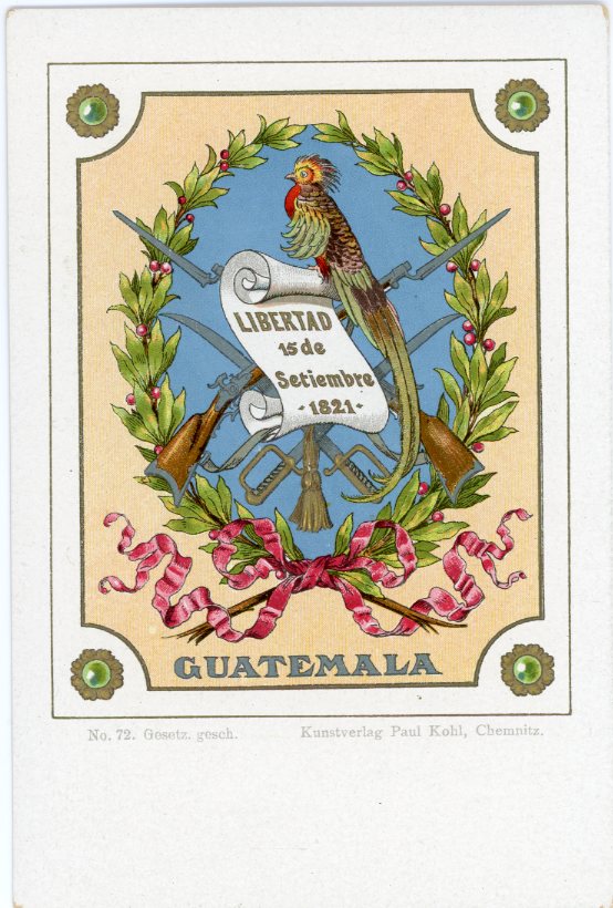 Guatemala: Unused commemorative postcard of 1821 Liberation coat of arms and Resplendent Quetzal bird