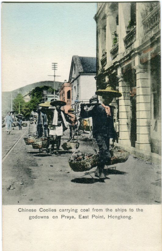 Hong Kong: Unused postcard titled ‘Chinese Coolies carrying coal from the ships to the godowns on Praya, East Point’. ed. Sternberg
