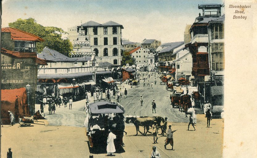 India: Unused postcard titled ‘Moombadevi Road, Bombay. Trams. Horse Carts
