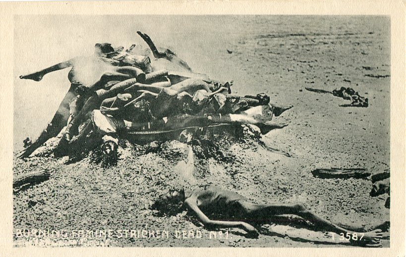 India: Unused postcard titled ‘Burning Famine Stricken Dead No. 1. ed. D. Macropolo