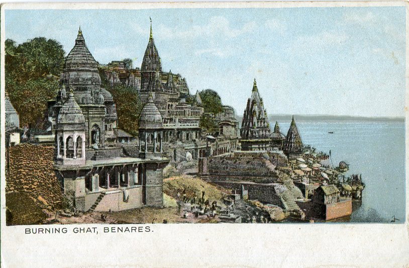 India: Unused postcard titled ‘Burning Ghat, Benares’.