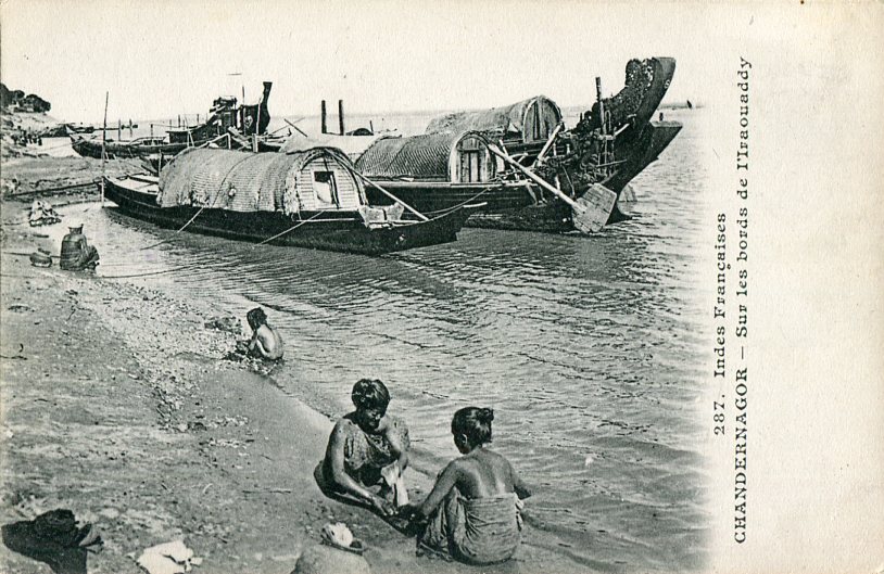 India: Unused postcard titled ‘Indes Francaises. Chandernagor – Sur les bords de I’Iraouaddy’.