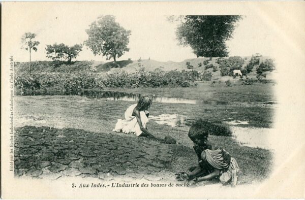 India: Unused postcard titled ‘Aux Indes. L’Industrie des bouses de vache’. ed. Ecoles Catholiques de l’Inde Australe