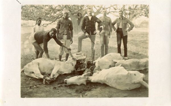 Unused photo postcard of butchered cows by soldiers