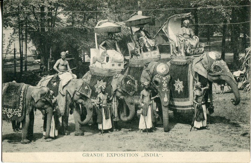 India: Unused postcard of Elephants titled ‘Grande Exposition’.