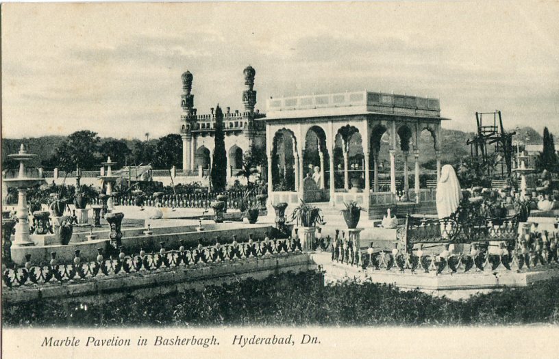 India: Unused postcard titled ‘Marble Pavelion in Basherbagh, Hyderabad’.