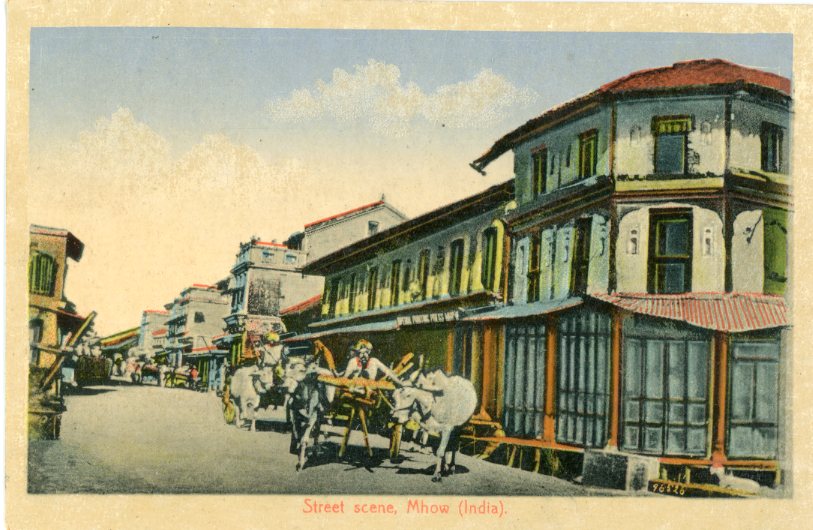 India: Unused postcard titled ‘Street scene, Mhow’. ed. H.A. Mirza
