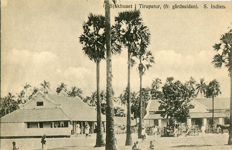 India: Unused postcard titled ‘Sjukhuset i Tirupatur, (fr. gardssidan). S. Indien’.