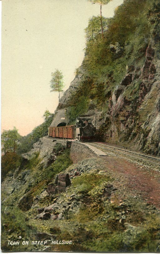 Unused postcard titled ‘Train on Steep Hillside’.