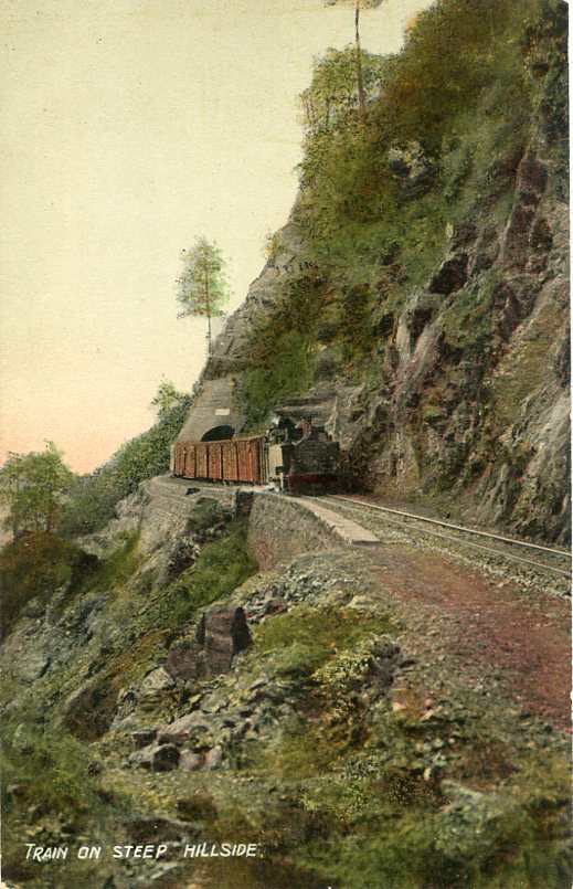 Unused postcard titled ‘Train on Steep Hillside’.
