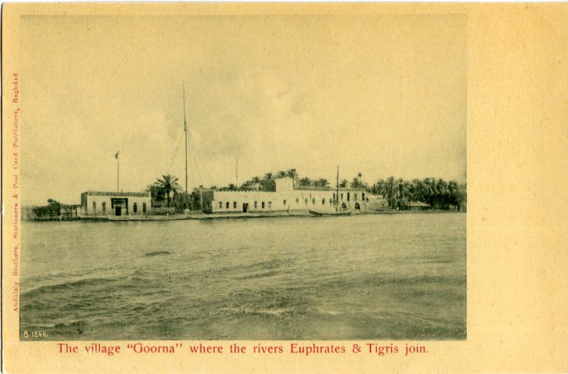 Iraq: Unused postcard titled ‘The village “Goorna” where the rivers Euphrates & Tigris join’. ed. Abdulaly Bros. B.1246