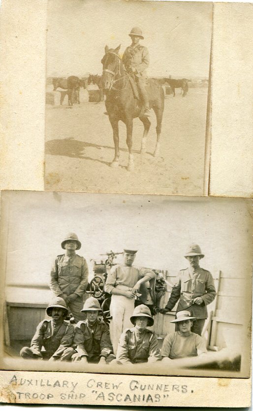 Iraq: Auxiliary crew gunners of troop ship Ascanias and mounted British soldier photograph stuck on postcard