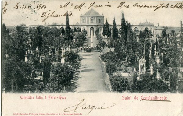 Türkiye: 1903 postcard titled ‘Cimetere latin a Feri-Keuy’ to Braga, Portugal. Stamp fallen. ed. Luwigsohn Freres
