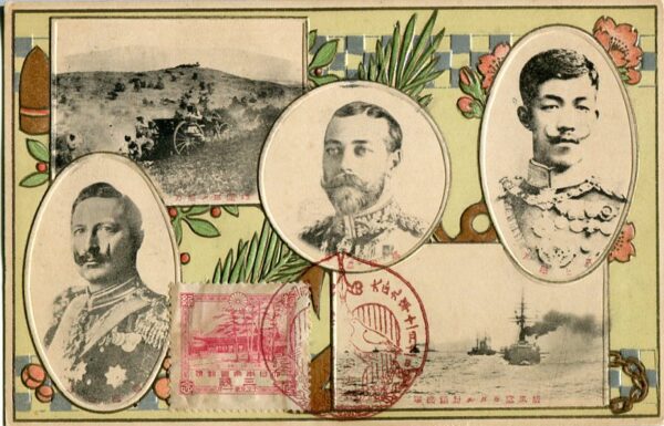 Japan: circa 1920 unused Russo-Japanese War propaganda embossed postcard with portraits of Emperor Taisho, German Kaiser Wilhelm II and British King George V franked with 3s Meiji Shrine stamp.