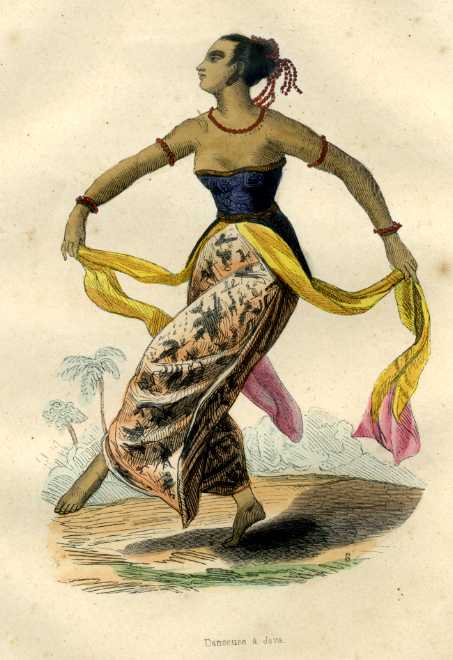 Danseuse a Java – Handcoloured gravure from Moeurs, Usages et Costumes de tous les Peuples du Monde by Auguste Wahlen, 1844. 165 x 255mm.