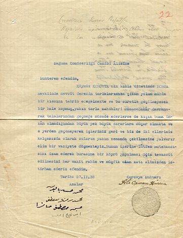 Cyprus: 1938 document in Turkish and English regarding a building a bridge on Borta region struck by Ottoman V.R KOTOVIA (Famagusta District) black negative seal.