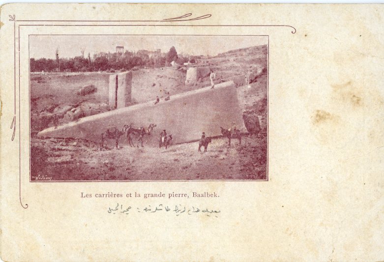 Lebanon: Unused postcard titled ‘Les carrieres et la grande pierre, Baalbek’.