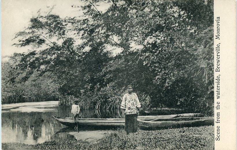 Unused postcard titled ‘Scene from the waterside, Brewerville, Monrovia’.