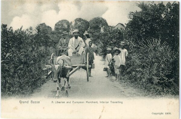 Liberia: Unused postcard titled ‘Grand Bassa. A Liberian and European Merchant. Interior Travelling’. 1905