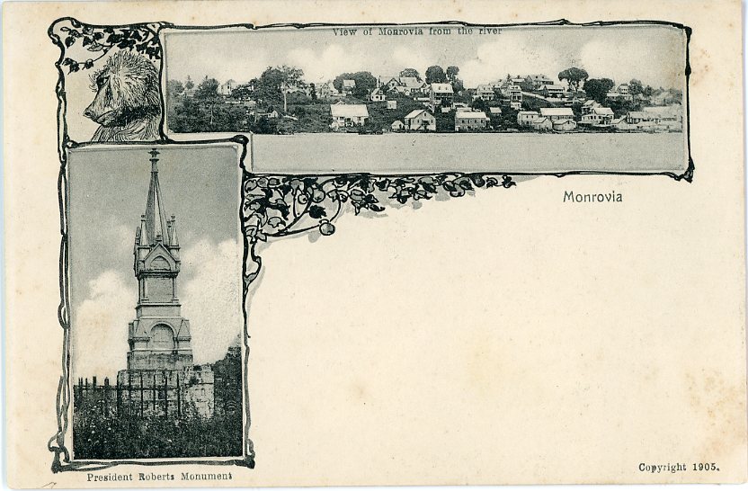 Liberia: Unused multi view postcard of Monrovia. President Roberts Monument, view from River. 1905