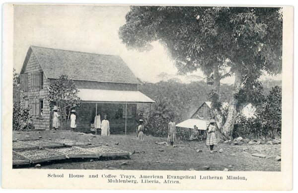 Liberia: Unused postcard titled ‘School House and Coffee Trays, American Evangelical Lutheran Mission, Muhlenberg, Africa’.