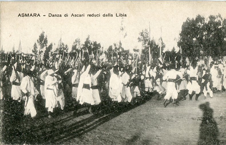 Libya: Unused postcard titled ‘ASMARA – Danza di Ascari reduci dall Libia’. ed. P. Beltrami