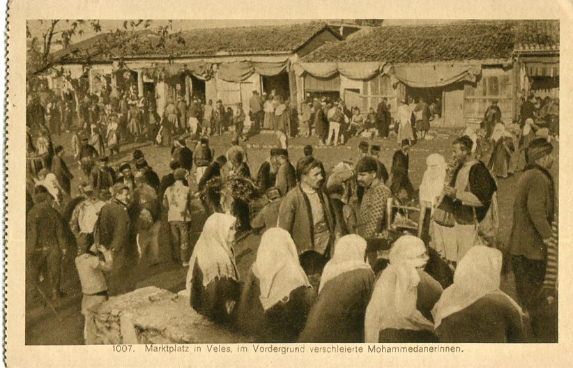 Macedonia: Unused postcard titled ‘Marktplatz in Veles, im Vordergrund verschleierte Mohammedaner Innen’.