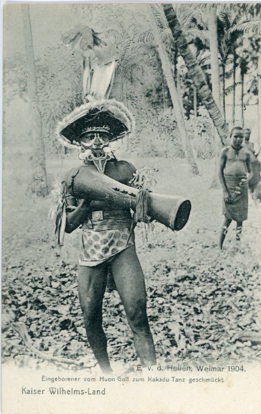 New Guinea: Unused postcard titled ‘Kaiser Wilhelmsland – Eingeborener von Huon Golf zum Kakadu Tanz geschmückt’.
