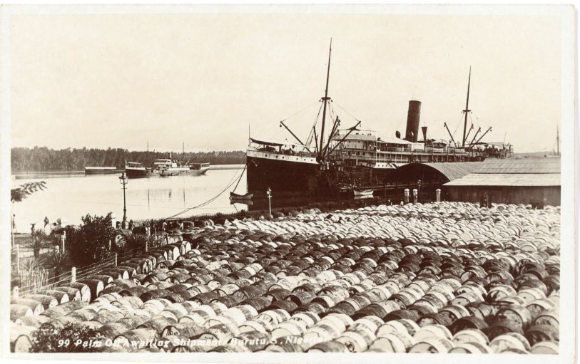 Nigeria: Unused photo postcard titled ‘Palm Oil waiting Shipment. Burutu’.