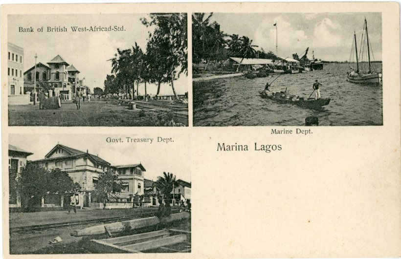 Nigeria: Unused multi view postcard. Bank of British West Africa – Treasury Dept. – Marine Dept.