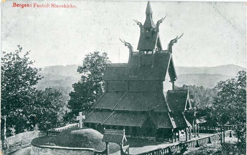 Unused postcard titled ‘Bergen: Fantoft Stavekirke’.
