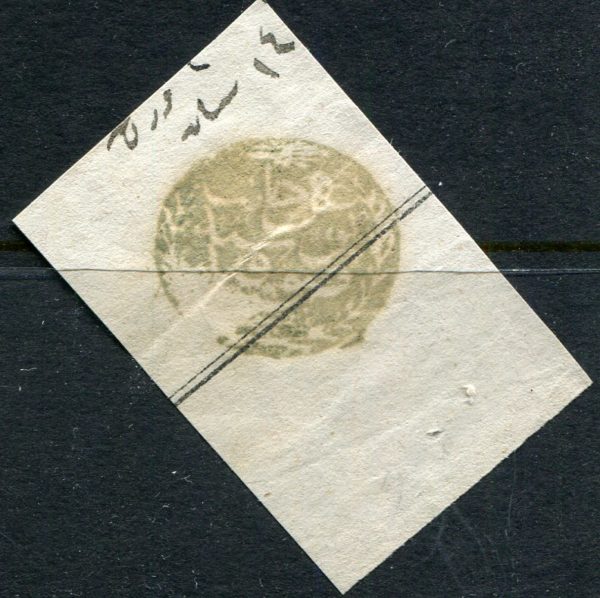 Ottoman Bulgaria: Cut-out from a Tatar document struck by AN CANIB-I POSTA-I SOFYA 259 (Principality of Bulgaria, A&P type 1) negative seal.