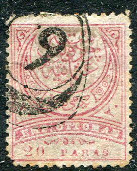 Ottoman Turkey: 20pa of 1890 UPU Empire stamp struck by 9 for Izmir Station (vilayet Aydin, A&P type 523, RR) handstamp.