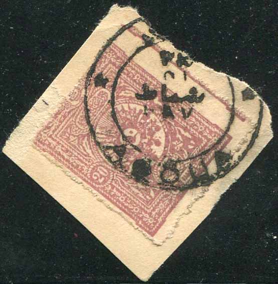 Ottoman Turkey: 20pa of 1892 stamp on piece struck by AĞVA – AGOUA (vilayet Istanbul, A&P type 1, RRR) bilingual datestamp.