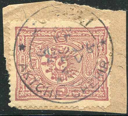 Ottoman Turkey: 20pa of 1892 stamp on piece struck by AKÇA ŞEHIR – AKTCHE-CHEHIR [today Akçakoca] (vilayet Kastamonu, unrecorded type by A&P) bilingual datestamp.