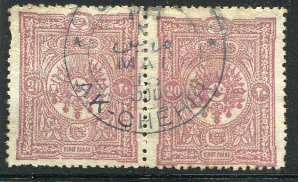Ottoman Turkey:Pair of 20pa of 1892 stamp struck by AKŞEHIR – AK-CHEHIR (vilayet Konya, A&P type 4, R) bilingual datestamp.