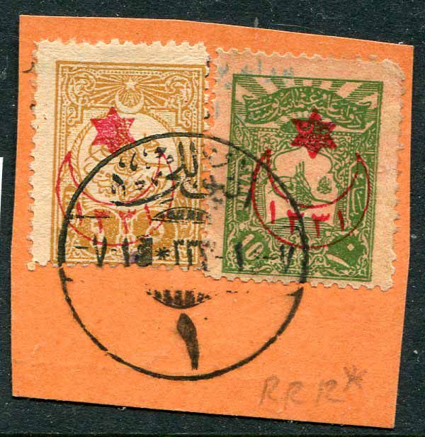 Ottoman Turkey: Two war opt stamps of 1916 on piece struck by ALPULLU 1 (vilayet Edirne, unrecorded type by A&P) all Arabic datestamp.