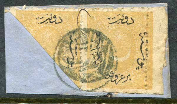 Ottoman Turkey: Single and bisected irregular perf. 1pi of 1869-71 Dulos stamps (isfila 71) on piece struck by AYVALIK 285 (vilayet Hudavendigar, A&P type 1, R) negative seal.