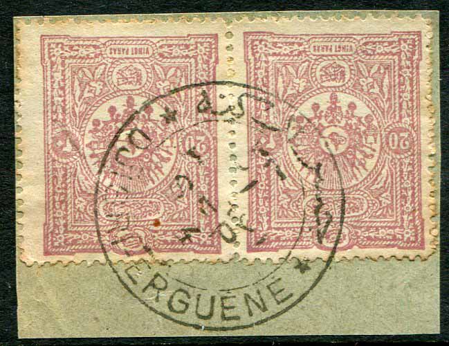 Ottoman Turkey: Pair of 20pa of 1892 stamps on piece struck by CISR-I ERGENE – DJESRI-ERGHENE [today Uzunköprü] (vilayet Edirne, A&P type 5, R) bilingual datestamp.