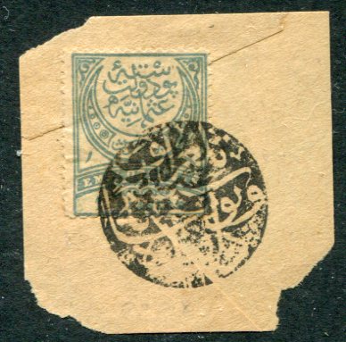 Ottoman Turkey: 1pi of 1890 on piece struck by superb TELGRAF ve POSTAHANE-I DARENDE 129. (vilayet Sivas, unrecorded type by A&P) negative seal.