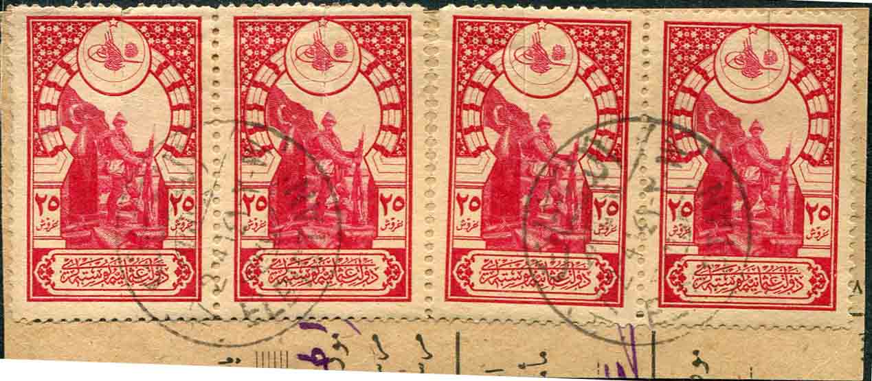 Ottoman Turkey: Two pairs of 25pi of 1917 pictorial stamps on piece struck by ELBİSTAN – ELBISTAN (vilayet Haleb, A&P type 3) bilingual datestamps.