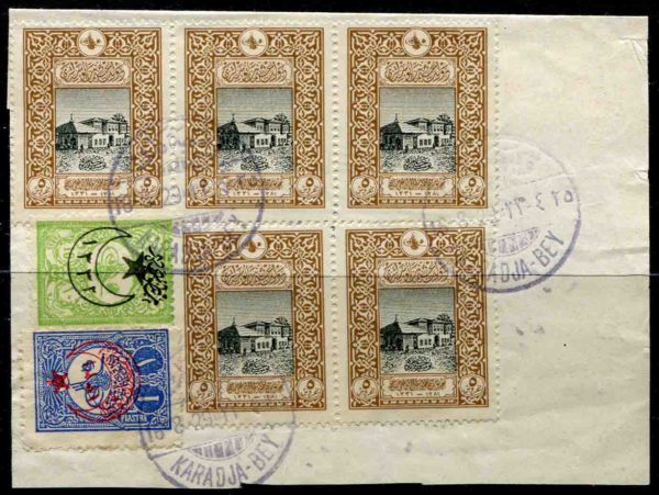 Ottoman Turkey: Multiple franking on piece struck by KARACABEY – KARADJA-BEY (vilayet Hüdavendigar, A&P type 4) bilingual datestamps.