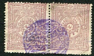 Ottoman Turkey: Pair of 20pa of 1892 stamps struck by KARAPINAR KARYESİ POSTA ŞUBESİ [today Karakuyu] (vilayet Aydin, A&P type 1, RR) negative seal.