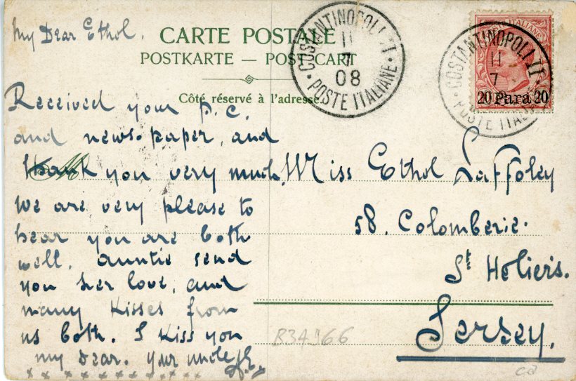 1908 Italian Levant Turkey Buyukdere to St Heliers Jersey