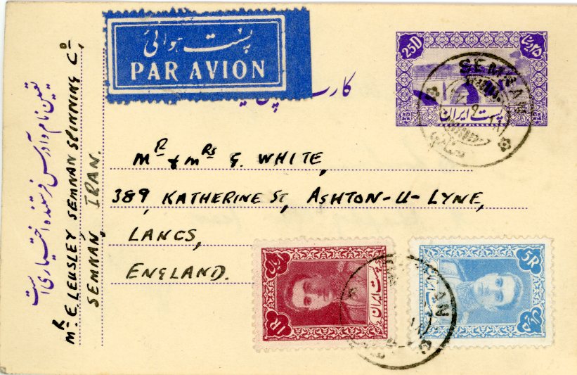 1948 Persia Semnan 25d Steam Train Bridge Postal Card to Ashton under Lyne