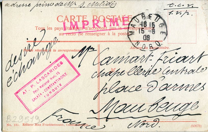 Turkey Bosphore Lascarides 1908 to Maubeuge ed Fruchtermann
